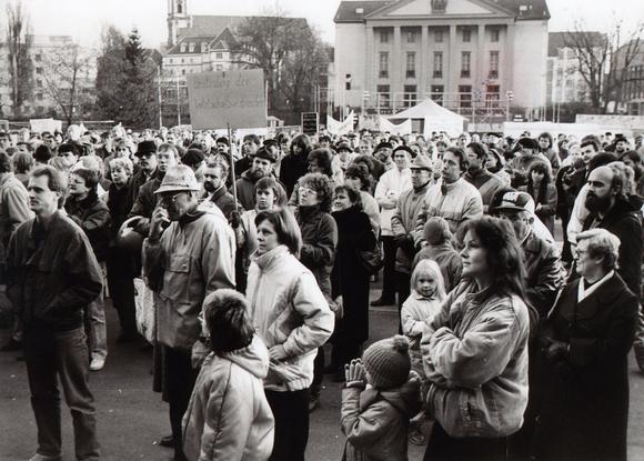 Demonstration des Neuen Forum vor der Stadthalle der Freundschaft, dem heutigen Congress Centrum Suhl