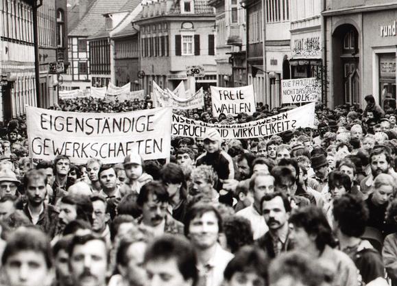 Protest march with banners to Ernst-Thälmann-Platz, now Platz der Deutschen Einheit