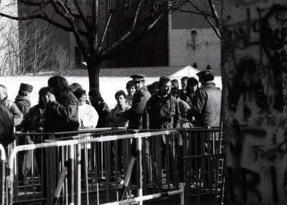 West Berlin residents entering East Berlin at the newly installed border crossing at Brandenburg Gate, festively opened on December 22, 1989. The opening ceremony was carried out by Helmut Kohl and the East German premier, Hans Modrow, and attracted more than 100,000 onlookers and hundreds of camera teams.