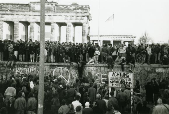 Schaulustige auf und vor der Mauer am Brandenburger Tor,Spectators on and in front of the Wall at Brandenburg Gate