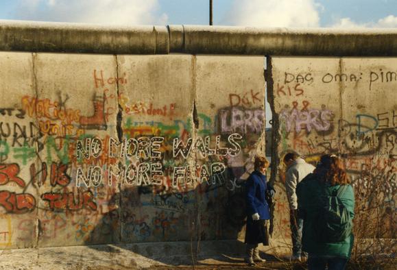 Berlin Wall (West), Berlin Wall graffiti (writing), chisel traces, group of people, Wall graffiti, Wall hole
