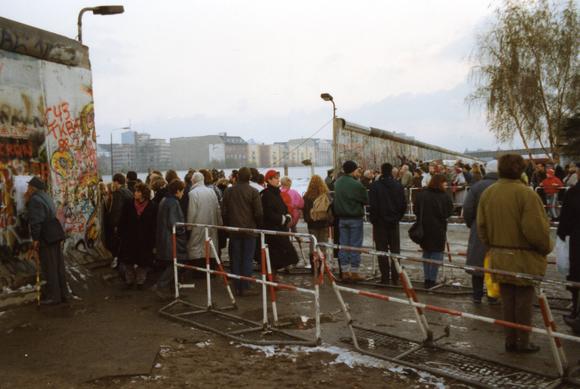 People waiting at the opened section of the Wall at Potsdamer Platz, installed as a new border crossing on 12 November 1989