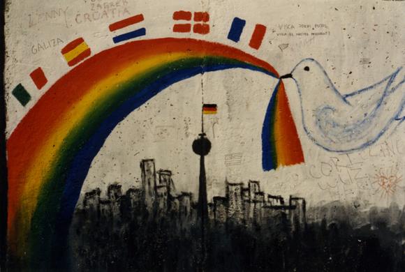 Wall art mural featuring a rainbow and a dove of peace above the Berlin cityscape