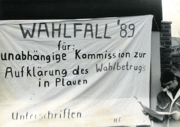 A banner for an initiative demanding the "independent enquiry into the electoral fraud in Plauen", referring to the local elections on 7 May 1989. Presumably photographed during the 7th mass demonstration in Plauen (Saxony), marches that were held every Saturday from 7 October 1980 until the first democratic elections took place on 18 March, 1990.