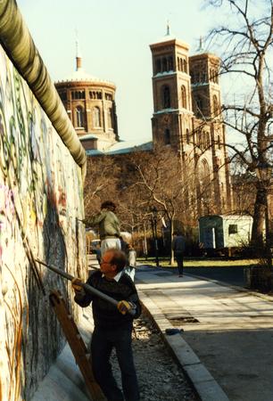 "Mauerspechte" (Berlin Wall "woodpeckers") at work on the Western face of the Berlin Wall; St. Thomas Church in the background