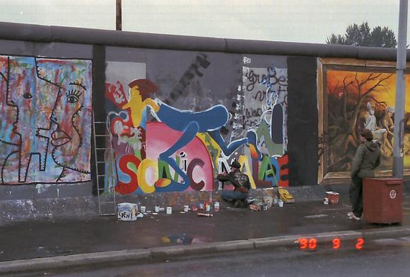 Greta Csatlós (from the artist group Ciccolina) at work on the Wall art mural "Sonic Malade" at the 1.3 km long East Side Gallery in Berlin-Friedrichshain; alongside the Wall art murals "O Povo Unido Nunca Mais Sera Veicido" by Joaquim Antonio Gocalves Borregana (on the right) and "Vergesst mir die Liebe nicht" by Henry Schmidt (on the left)