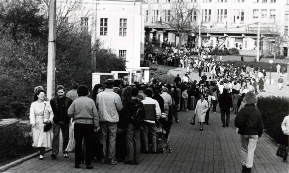 Warteschlange vor der Staatsbank der DDR in Plauen