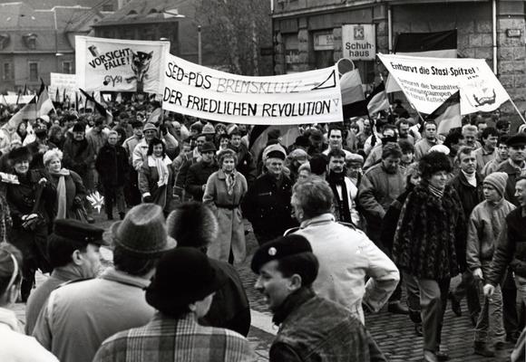 Banner, "SED-PDS is a hindrance to the peaceful revolution!". Demonstrators, presumably taken during one of the mass protests in Plauen (Saxony), that were held every Saturday from 7 October 1989 until the first democratic elections took place on 18 March, 1990. (retreived and translated from
