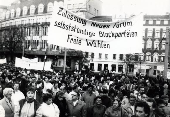 Banner,"Admit the New Forum; Independent Bloc Parties; Democratic Elections". Demonstrators, presumably taken during one of the mass protests in Plauen (Saxony), that were held every Saturday from 7 October 1989 until the first democratic elections took place on 18 March, 1990. (retreived and translated from Wikipedia: Montagsdemonstrationen 1989/1990 in der DDR, on 23 April 2009)