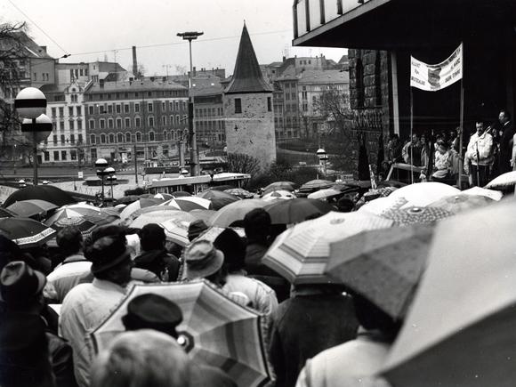 Demonstrators, presumably taken during one of the mass protests in Plauen (Saxony), that were held every Saturday from 7 October 1989 until the first democratic elections took place on 18 March, 1990. (retreived and translated from