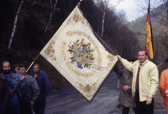At the new border crossing between Lauenstein, a part of the Bavarian city Ludwigsstadt, and the Thuringian town of Probstzella. The border crossing was opened to pedestrian and road traffic on 12 and 13 November, 1989, respectively. The photo was taken near Falkenstein cliff, after which the border crossing was named.