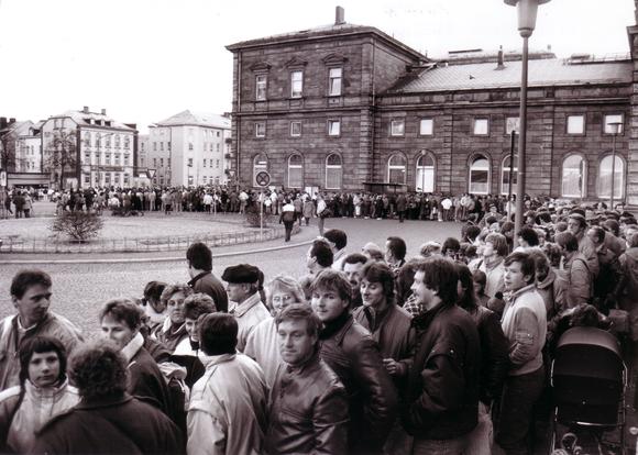 Thousands of East German refugees travelled with special East German Railway trains, arriving in the West German town of Hof in October 1989. After fleeing to the German Embassy in Prague, many of the people had been there since August until finally granted permission to leave the country on 30 September.