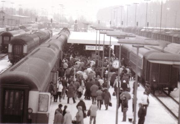 Mit Sonderzügen der Deutschen Reichsbahn trafen im Oktober 1989 tausende DDR-Flüchtlinge in Hof ein. Sie waren z.T. seit August in die Deutsche Botschaft in Prag geflüchtet, bis ihnen am 30. September die Ausreiseerlaubnis erteilt wurde.