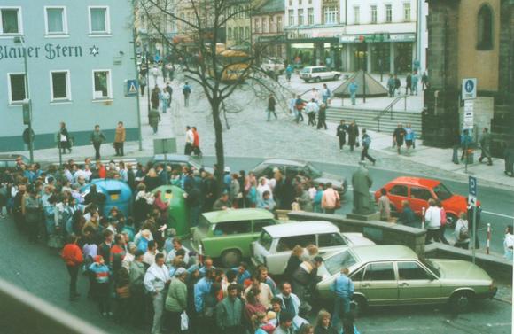 "Hof/Sonnenplatz with a view of the old historic quarter. This same scene was repeated daily as of 10.11.89 and shows the people waiting in line to collect "welcome money" at the central office of the Sparkasse Bank."